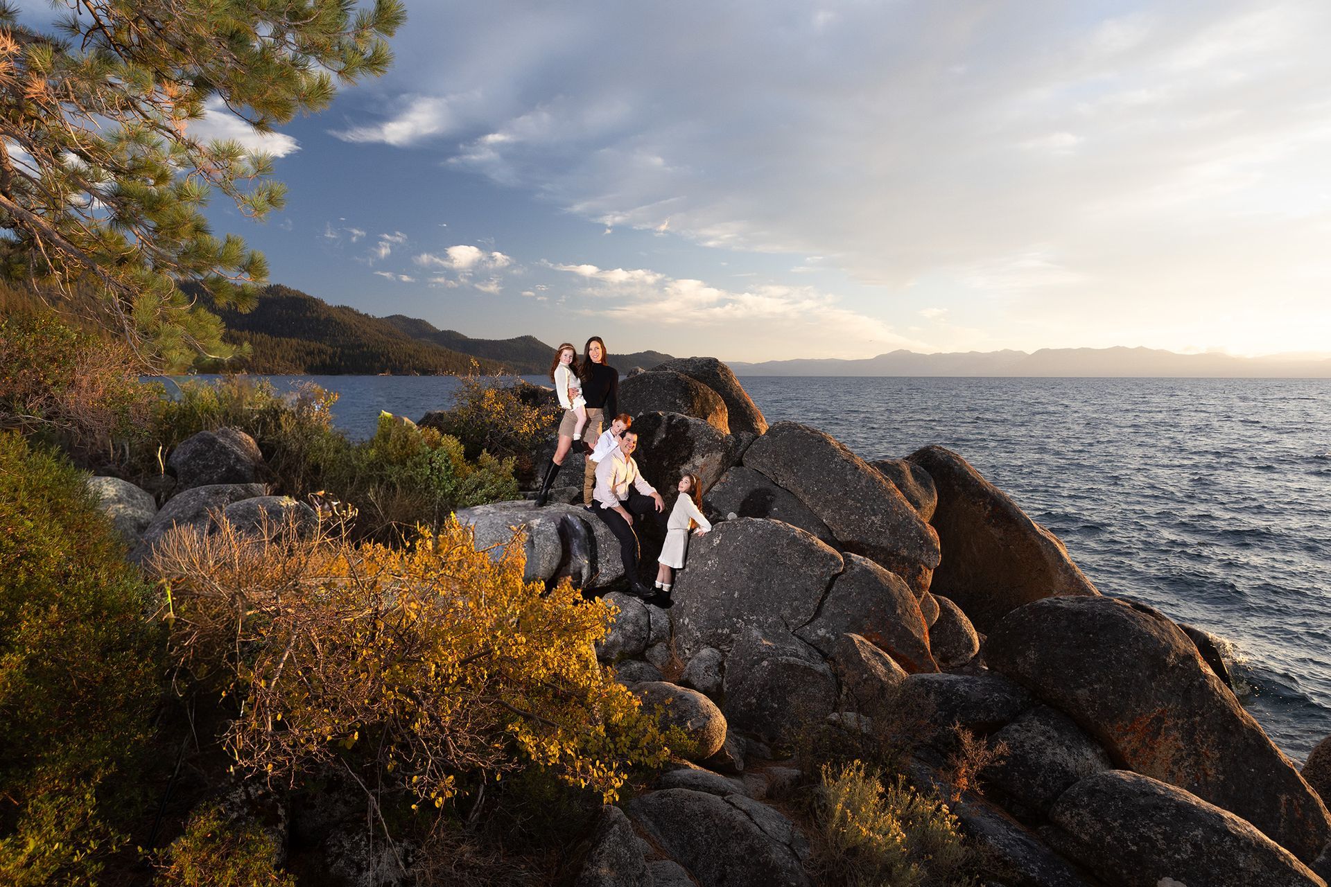 As the sun dipped lower, the kids explored with pure curiosity — climbing boulders, laughing, and discovering little treasures along the shoreline. Every direction offered a new photo opportunity: the soft shimmer of the lake, the rugged textures of the rocks, and that iconic mountain backdrop that makes this region a dream for any Tahoe photographer.