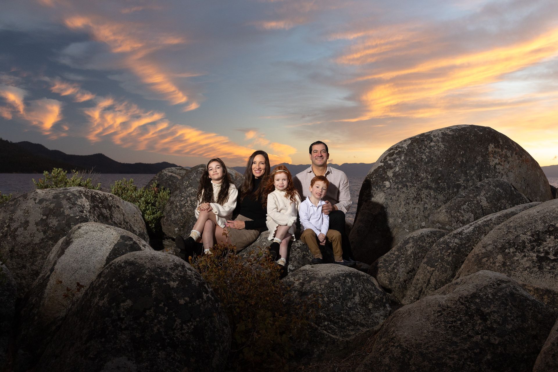 As the sun dropped lower, we moved closer to the lake, where reflections turned the water into a painter’s palette of orange, gold, and blue. It was one of those rare evenings where everything aligns — light, color, and connection. The final gallery was full of candid joy and timeless elegance, exactly what makes fall family sessions in Tahoe so special.